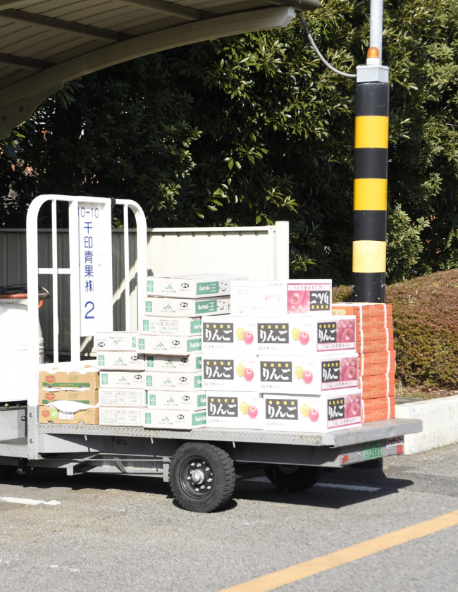 配送業者さんのトラックが場内に入ったら、安全かつ迅速に積み込み作業を行います。野菜も果物も新鮮さが命です。少しでも早く日本中の食卓に届けるため、技術を磨き続けます。